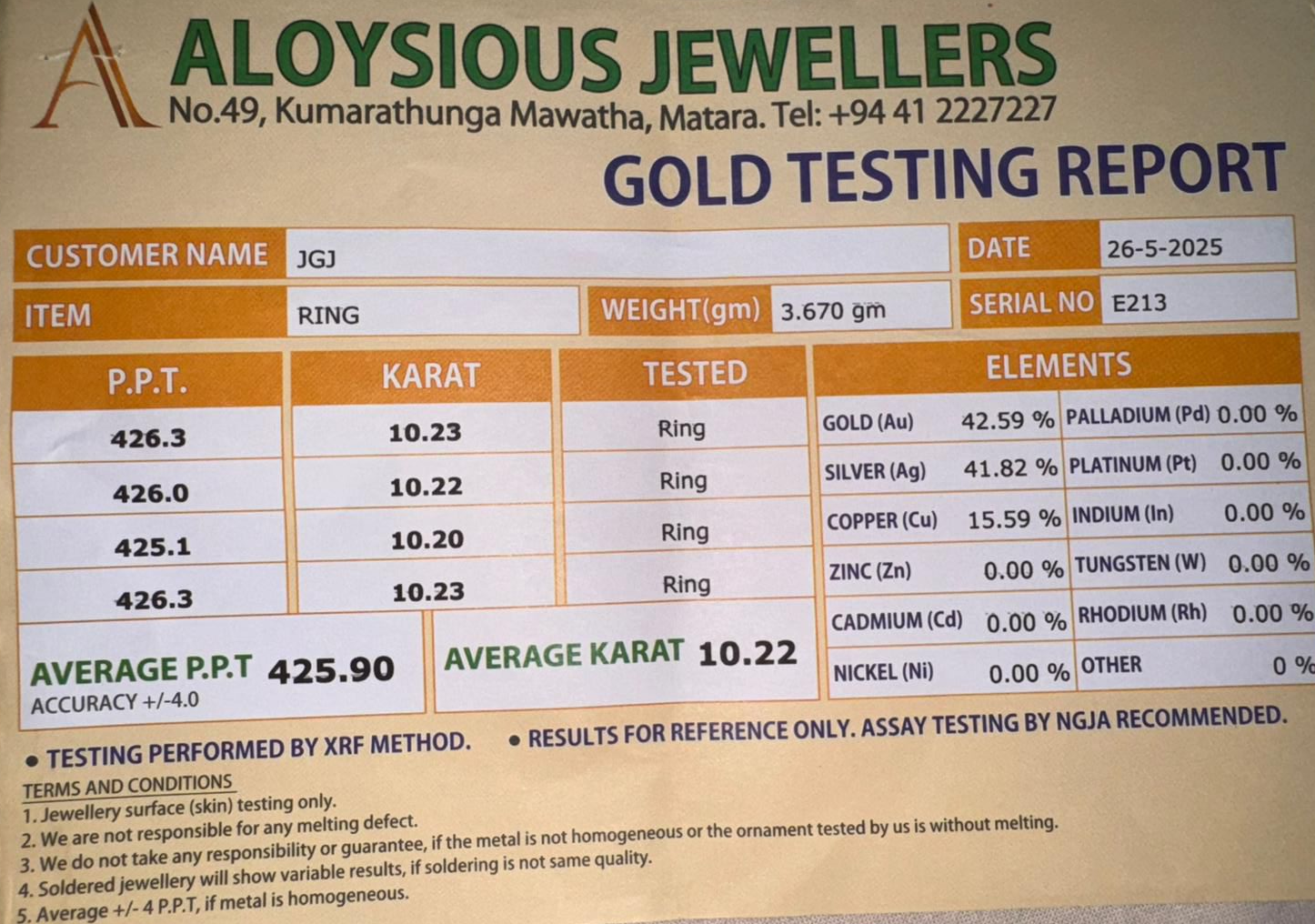 Gold Test Certificate